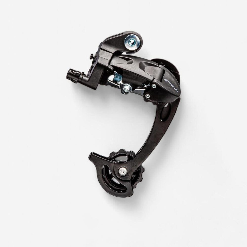 Long screed rear derailleur compatible with Shimano and Btwin 7,8,9-speed drive trains for fluid and precise gear changes.