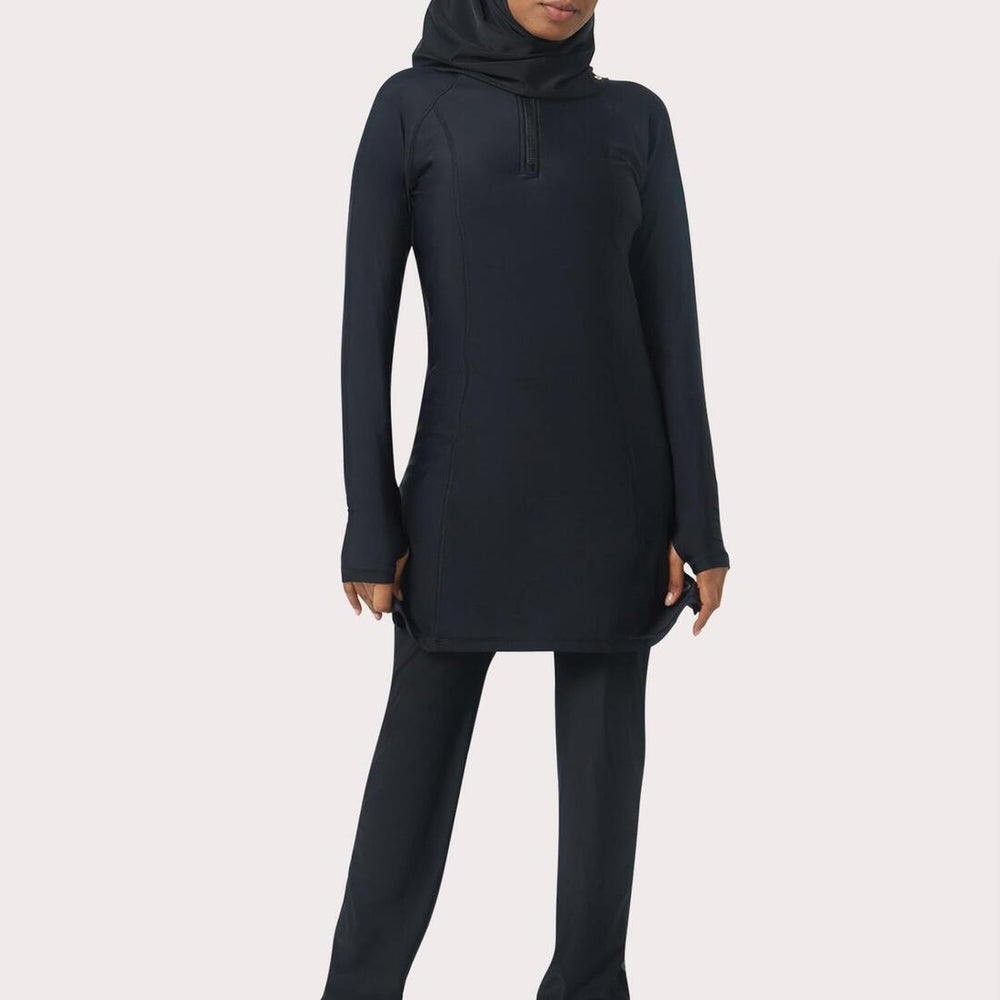 This unique and comfortable three-piece design is perfect whether looking for modesty or extra sun protection, while enjoying water sports at the beach or pool. One of our best-sellers in the Modest swimwear collection made with soft stretch fabric, the outfit includes a mid-length long sleeve Swim Tunic with front zipper , coordinated full length Swim Trousers and a well-fitted Swim Shaela. Go Ahead, Love the Sun!