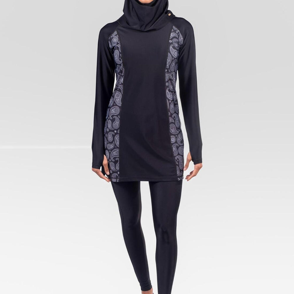 This unique and comfortable three-piece design is perfect whether looking for modesty or extra sun protection, while enjoying water sports at the beach or pool. One of our best-sellers in the Modest swimwear collection made with soft stretch fabric, the outfit includes a mid-length long sleeve Swim Tunic with front zipper , coordinated full length Swim Trousers and a well-fitted Swim Shaela. Go Ahead, Love the Sun!
