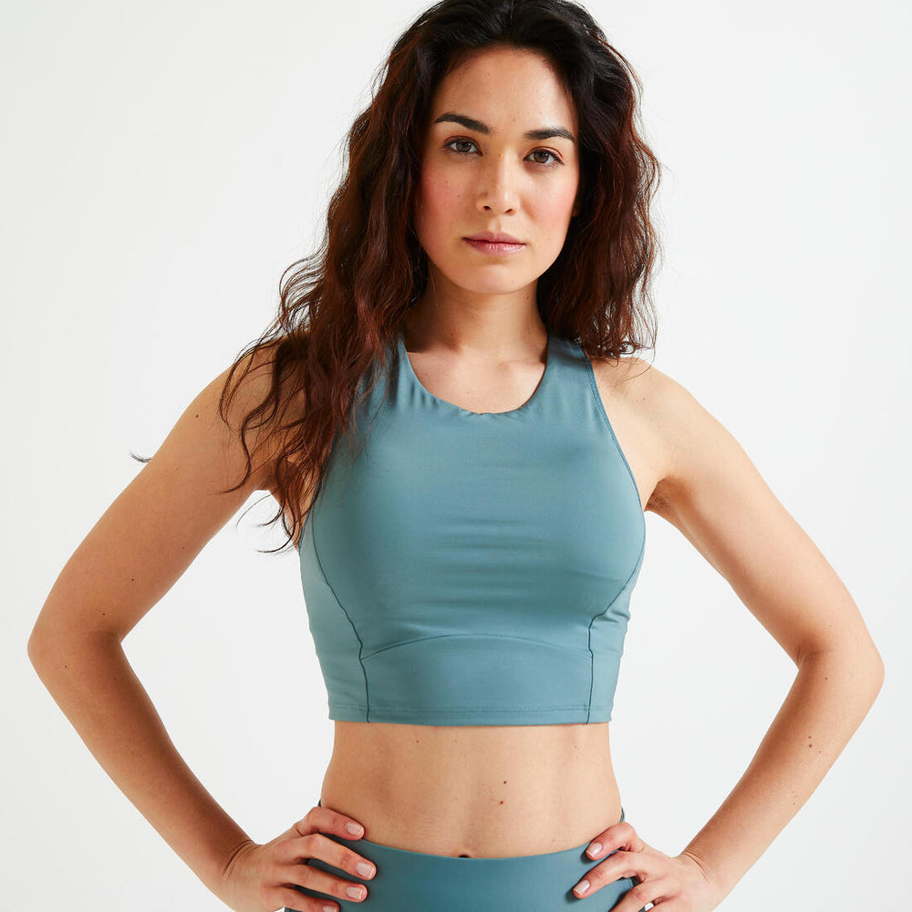 The originality of this sports bra is that it combines the support benefits of a bra with a crop cut. The first layer of the sports bra is covered by a second layer of fabric to create a crop top look. Pair with leggings to create a trendy, sporty look.