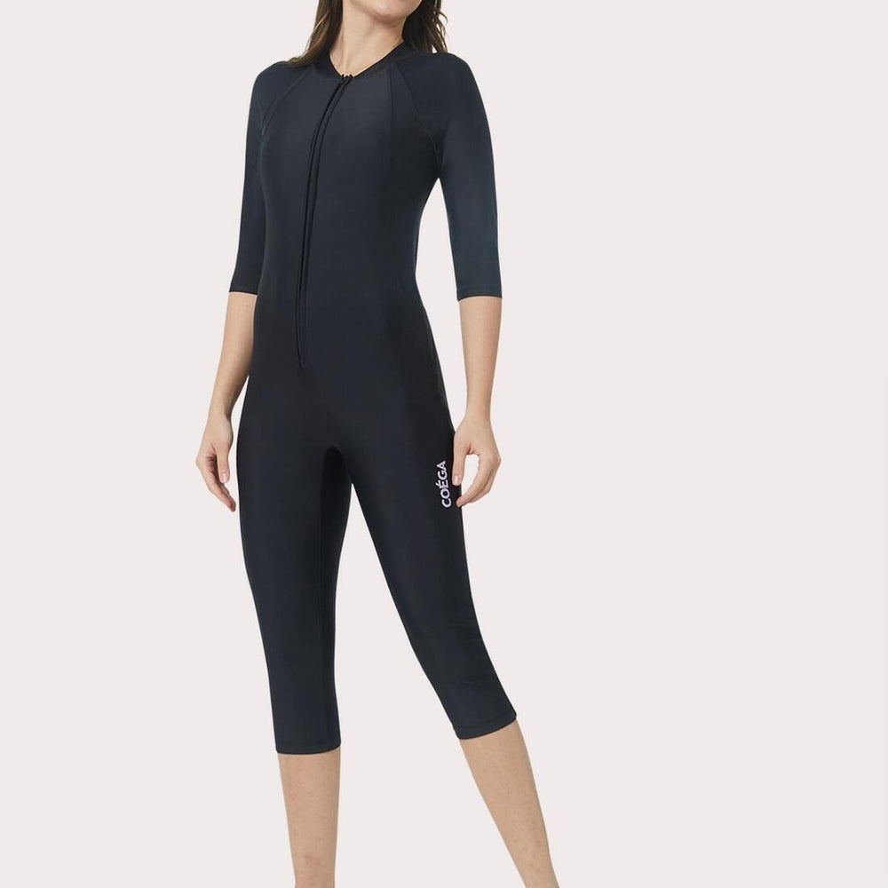 The 3/4 sleeves and 3/4 length legs provide coverage and sun protection where needed. Sturdy front zip, built-in support with bra padding, flat-locked seams, and side panels are all key to the high comfort and smooth lines of the garment. The popular COEGA Slim-Kini works automatically to help enhance your figure in comfort and style all-day long.
