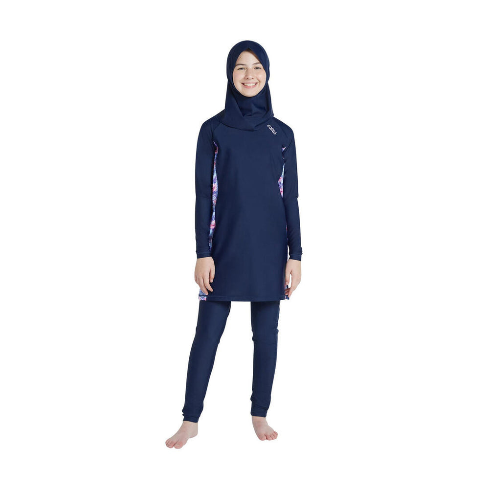 This unique and comfortable three-piece design is perfect whether looking for modesty or extra sun protection, while enjoying water sports at the beach or pool. Made with soft stretch fabric, the outfit includes a mid-length long sleeve Swim Tunic with matching full length Swim tights and a well-fitted Swim Shaela. Go Ahead, Love the Sun!
