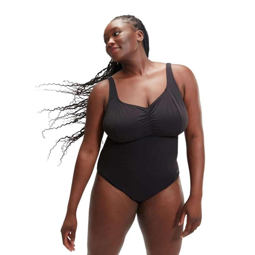 Timeless and elegant, this stunning black AquaNite swimsuit uses gentle ruching and a soft V-neckline design to flatter your shape.