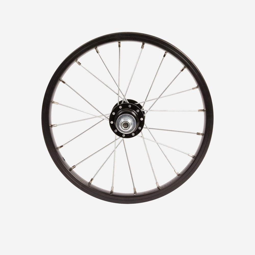 This kids' bike 14" rear wheel is fitted with drum brake and is suitable for rim braking.